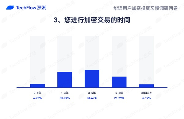在本次问卷调研中,我们对受访者进行加密交易的时间进行了详细统计,数据显示华语用户在加密交易经验领域的经验分布相对均衡,这为加密市场提供了一个稳固且多样化的用户基础,有助于市场的长期发展。