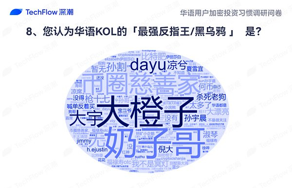 本次问卷调研中,我们对当前受访者最认可的加密 KOL 进行了数据收集,本题为非必答题,感兴趣的受访者可以填写提交,根据反馈中各 KOL 的提及频率,我们制作了词云展示。