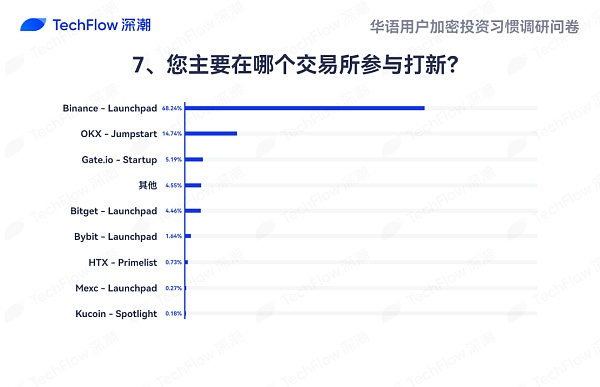 68.24% 的受访者选择 Binance 的 Launchpad 平台。这说明 Binance 的 Launchpad 在新项目发行方面拥有绝对的领先地位,成为大多数用户参与打新的首选交易所。