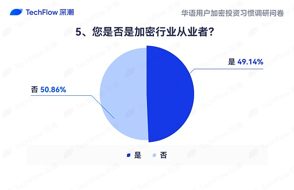 具体而言:49.14% 的受访者是加密行业的从业者,这意味着接近一半的受访者深度参与加密行业。另外 50.86% 的受访者并非加密行业的从业者,更多地扮演投资者或爱好者的角色,关注加密货币的投资机会和市场动态。