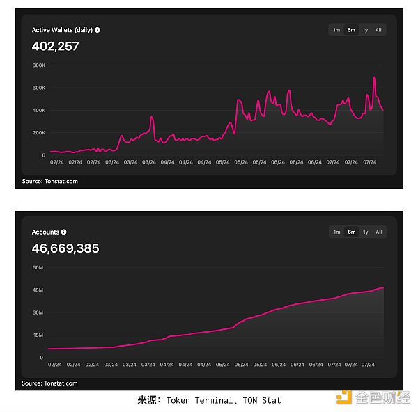 TON 生态系统的增长指标令人瞩目。短短六个月内,链上每日活跃用户从 20 万增长至 40 万,而钱包数量从不到 1000 万激增至 4600 多万。