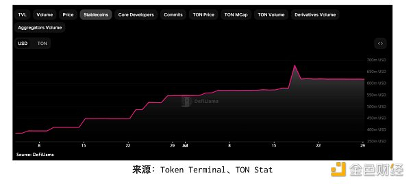 对于任何区块链生态系统的蓬勃发展,稳定币已成为实现资金转移、DEX 交换和 Perp 交易等成熟用例的基本要素,因此我们将稳定币的整合和增长视为生态系统增长的关键指标。值得注意的是,2024 年 4 月,Tether 宣布直接与 TON 整合,实现原生铸造和赎回。这允许更深的 DEX 流动性和更多资本的引入。仅 3 个月内,稳定币流动性就增长到超过 6 亿 USDT。