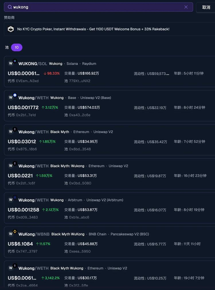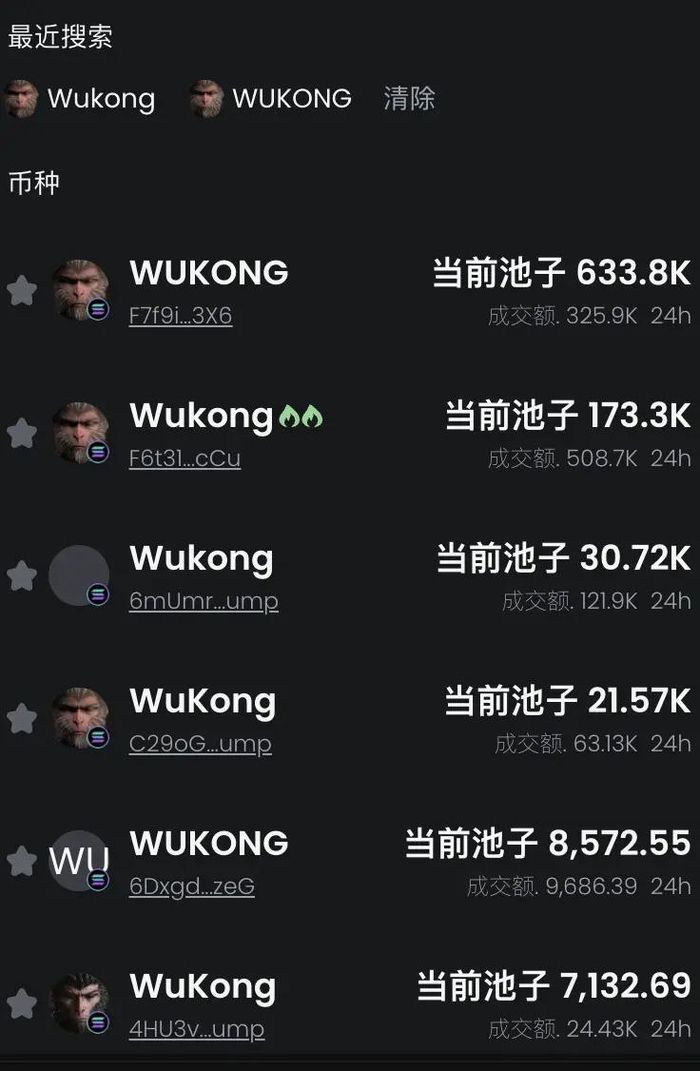 蹭该游戏热度的加密货币有更惊人的涨幅。根据 gmgn . ai 数据,发行于 Solana 上 Meme 币$ WuKong 在当日 24 小时涨幅超过99999%,有用户5小时就赚走35万美元。与此同时, Solana 上出现了多个$ WuKong 同名 Meme 币的交易池,涨跌不一。此外, ETH 和 BNB 上也出现了$ WuKong 同名 MEME 币,均呈现不同涨幅。