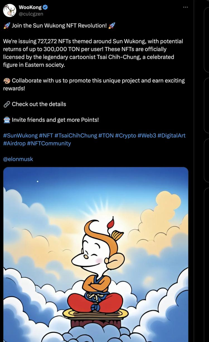 有一个名为“ SUn WuKong ”的 NFT 宣称是蔡志忠与 Caturapramana Universe 合作推出《西游记》 NFT ,发 X 蹭上了《黑神话:悟空》的热度,但他们还没有开放 Mint ——只是不知道等他们开启 Mint 的时候,《黑神话:悟空》这碗饭还热不热?