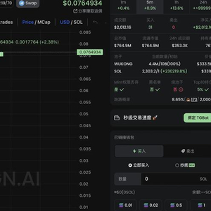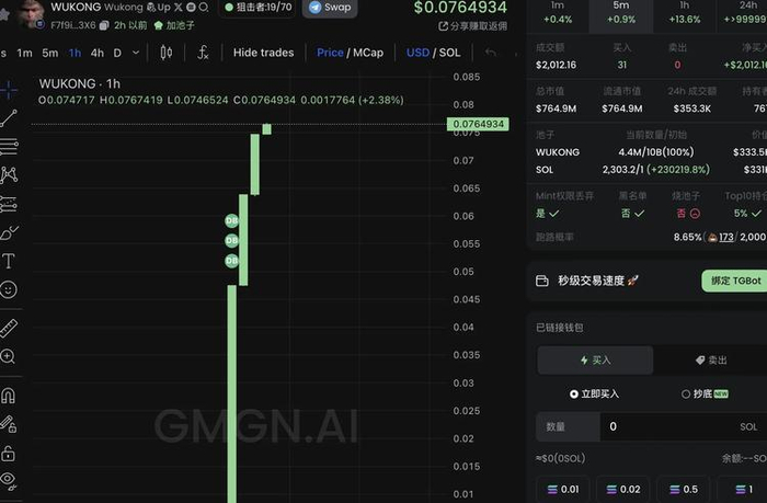 根据 gmgn . ai 数据,Solana 的 Raydium 上最大的一个$ Wukong 池子目前已有 900 多人参与了这个池子,该$ Wukong 由 C6rFbLz2sQPCqcqjtib1hE69o1xgAuTu6aMqD9MWtBAD 创立,该用户买入总成本约为26万美元,截至发稿,该账户目前已获利,实现盈利约35万美元,还有580万浮盈。