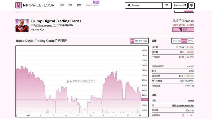 截至8月28日,特朗普第一系列数字交易卡地板价报206.62美元,30天下跌35.86%。第二系列数字交易卡地板价报40.11美元,30天下跌37.48%,第三系列MugShot地板价报121.06美元,30天下跌24.57%。