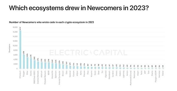 对此,Josh Stark引用了Electric Capital 开发者报告中的数据进行了反驳。而Vitalik也回复说自己喜欢这个图表通过将 L2 列为单独类别来低估以太坊的成功,但即使有这种障碍,以太坊仍然看起来很棒。