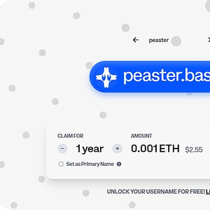 铸造您的配置文件的注册价格为每年 0.0001 ETH(+10 个字符的名称),但注册一个令人垂涎的 3 个字符名称(如“abc.base.eth”)每年需要花费 0.1 ETH。就我个人而言,我选择了 peaster.base.eth,支付了 0.001 ETH,按当前 ETH/USD 汇率计算约为 2.55 美元。