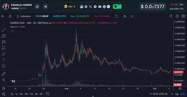副总统卡玛拉·哈里斯相关的Meme代币Kamala Harris Token(KAMA)表现也突出。KAMA于2023年8月推出,其名称源自哈里斯副总统的名字,但实际上与她本人没有直接关联。