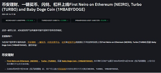 但9月16日的转折,就让事情变得扑朔迷离了起来。9月16日,币安发布上币公告,称将在简单赚币、闪兑和杠杆交易添加 FirstNeiro on Ethereum(Neiro)、Turbo(TURBO)和 Baby Doge Coin(1MBABYDOGE)。币安保证金将在全仓和逐仓杠杆上新增 Neiro、TURBO 和 1MBABYDOGE作为可借资产,并在全仓和逐仓杠杆上新增 Neiro/USDT、TURBO/USDT 和 1MBABYDOGE/USDT 交易对。