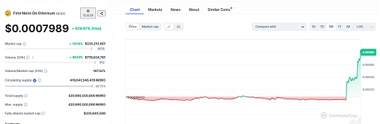 在此消息影响下,小写Neiro绝地重生,迎来了加速涨势,从0.00036飞涨至0.00082美元,2天上涨约3倍,现报0.00079美元,市值站稳3亿美元上方。大NEIRO则被反将一军,价格暴跌超30倍,最低来到0.0038美元,市值跌破400万美元,尽管后续有所回升,但仍相对高峰期降幅明显,目前其价格稳定在0.072美元左右,市值不足8千万。