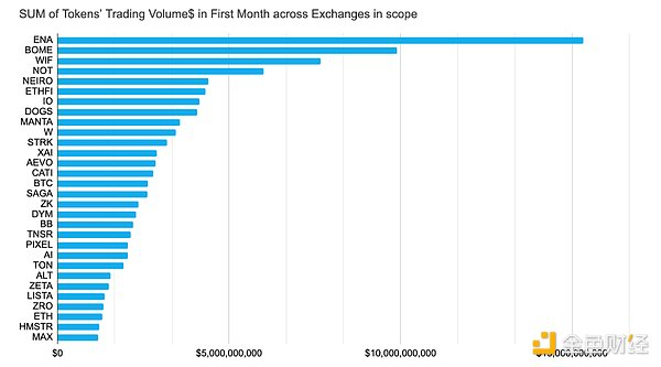 上图显示了今年迄今为止交易量最大的 30 种代币。ENA 领先,第一个月的交易量超过 150 亿美元。在热门 meme 代币中,BOME、NElRO 和 WIF 的交易活动量显著增加,与此同时,ZRO、TON 和 lO 等代币在第一个月的交易量从 10 亿美元到 50 亿美元不等。