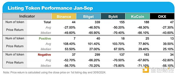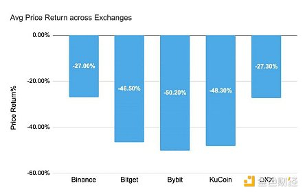 相比之下,币安和 OKX 的表现相对较好,平均回报率分别为 -27.00% 和 -27.30%。这表明币安和 OKX 实施了更有效的选择性上线策略,在充满挑战的山寨币市场环境中,代币价格表现相对较好。