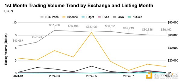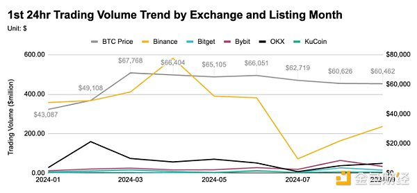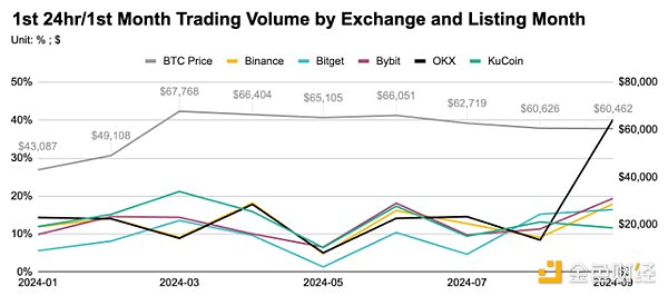 上线后,根据交易所的不同,前24小时的交易量通常占第一个月交易量的5-20%。OKX在9月份被记录为异常值,其40%的活动是由CATl和HMSTR代币驱动,而KuCoin在前几个月表现出更强的参与度。