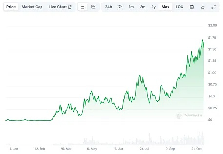 最大的猫咪主题表情包币——Popcat(POPCAT)是今年市场表现最好的货币之一。10 月 29 日,其价格创下近 1.80 美元的历史新高,目前价值 1.65 美元(自 1 月 1 日以来上涨了 23,500%)。