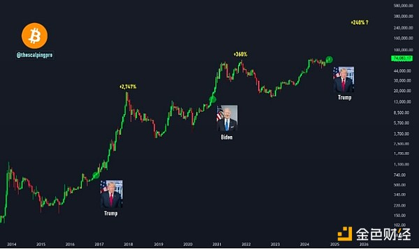 “2016 年大选后,BTC 价格上涨了 2747%。2020 年大选后,BTC 价格上涨了 360%,2024 年,总统支持比特币。即使 240% 的涨幅也意味着每枚比特币 25 万美元。”