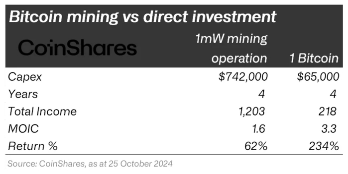 我们的模型还能够评估挖矿操作的盈利能力。目前,采用集装箱存储的 1 兆瓦项目成本约为 74 万美元,包括像 Canaan Avalon A1566 这样的低成本、高哈希率矿机。假设比特币在 2026 年底达到 13 万美元,电力成本维持在当前行业平均的每千瓦时 4.5 美分/千瓦时,则该项目的资本投资将在运营的前 27 个月内完全回收。该模型还假设随着价格上涨,哈希率也会继续上升。然而,四年展望显示,在当前条件下,直接投资比特币的回报可能比挖矿更高。