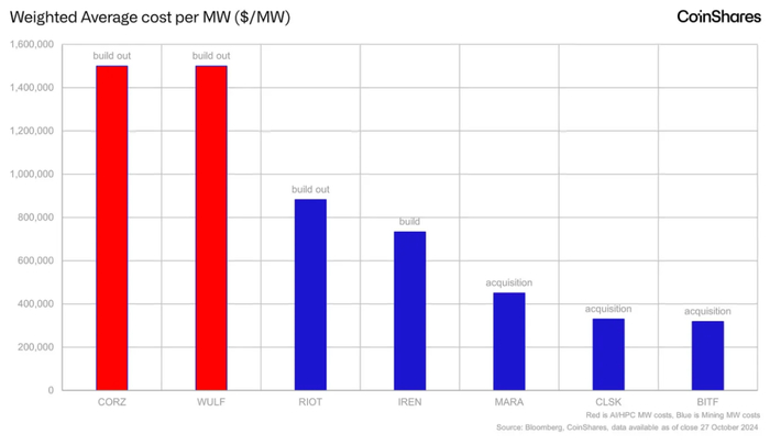 随着挖矿成本上升且每四年区块奖励减半,矿企被迫削减成本并增加产量。像 Riot 这样的公司已通过限电策略来抵消成本。正如 Cleanspark 和 Bitfarms 的案例,收购已建成的基础设施比新建更具成本效益。专注于 AI 基础设施的公司,如 Core Scientific,也开始转向高功率密度的设置以支持未来增长。