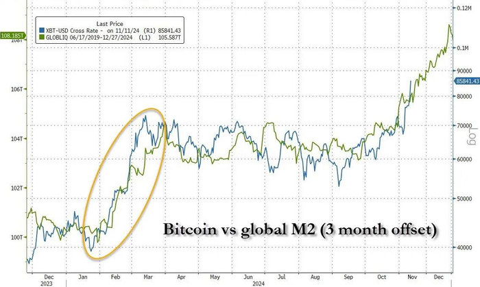 跟踪某些相关资产或指标——M 2 供应(3 个月偏移)与比特币价格高度相关。