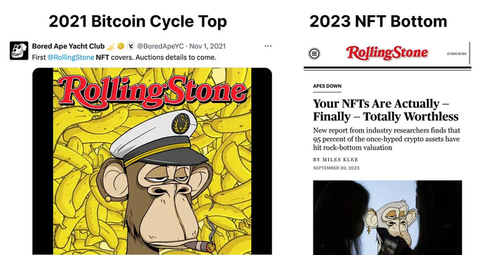 随着普通交易者看到比特币和加密货币在主要新闻频道的普及,加密货币频道可能成为非加密用户获取信息的主要来源。反向操作主流媒体信息也可能是接近市场顶部时出售的有效策略——《滚石》杂志在 NFT 熊市底部时就曾是一个很好的指示。