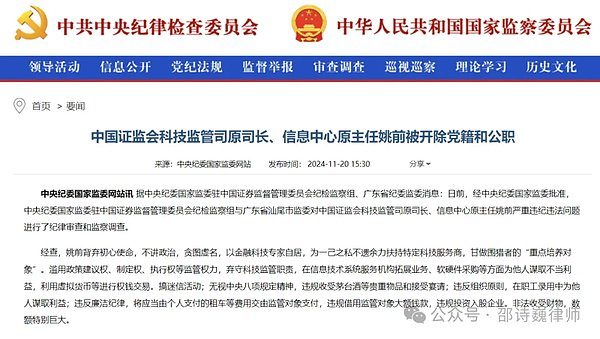 2024年11月20日,官方通报了一则消息。中国证监会科技监管司原司长、信息中心原主任姚前被开除党籍和公职。通报指出,姚前为一己之私不遗余力扶持特定科技服务商,甘做围猎者的‘重点培养对象’利用虚拟货币等进行权钱交易。