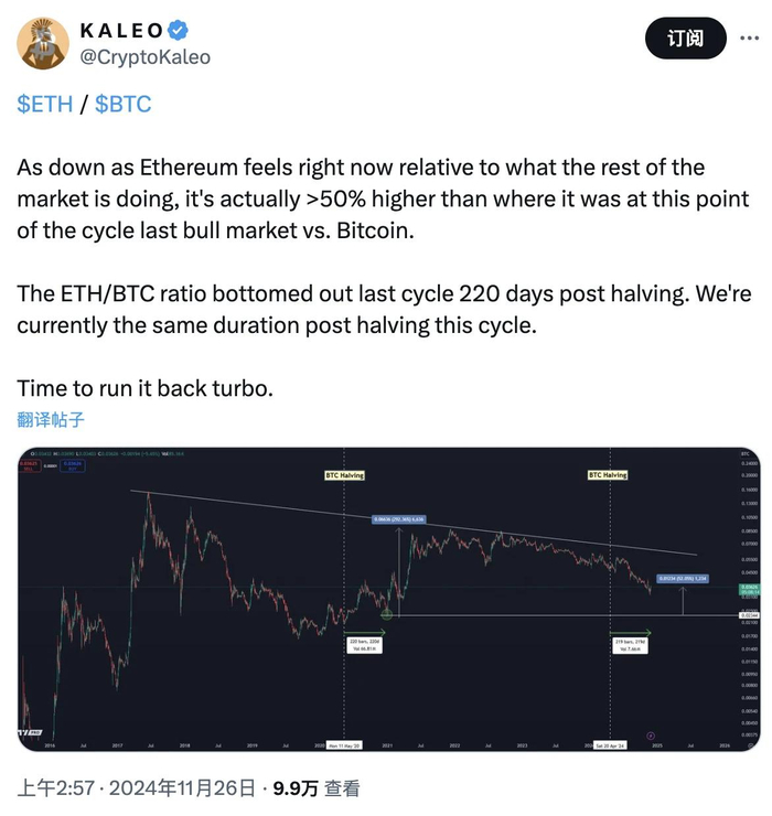 与此同时, 知名分析师 Kaleo 则贴出历史数据表示,在上一轮牛市 ETH/BTC 的汇率曾在减半后 220 天触底,今天则正好是本次减半后的第 220 天……考虑到近期 ETH 久违地呈现出了逆市上涨态势,不排除类似的剧本将再次上演。