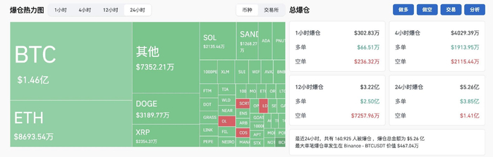 衍生品交易方面,Coinglass 数据显示,过去 24 小时全网爆仓 5.26 亿美元,多单爆仓虽依旧占据过半比例,但空单爆仓规模同样高达 1.41 亿美元。从币种来看,其中 BTC 爆仓 1.46 亿美元,ETH 爆仓 8693 万美元。