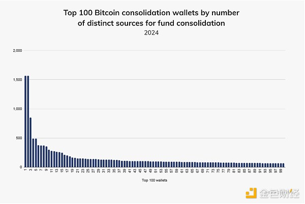 虽然上面的例子相对简单,但更复杂的洗钱网络具有整合钱包的功能,可以聚合来自数十个甚至数百个中间钱包的资金。查询 Chainalysis数据可以让调查人员找到主要的整合钱包,这些钱包通常可以作为有用的线索。例如,2024 年年初至今排名前 100 的比特币整合钱包——所有这些钱包都从交易所进行了两跳交易——从超过 14,970 个不同地址接收了价值近 10 亿美元(9.68 亿美元)的比特币。