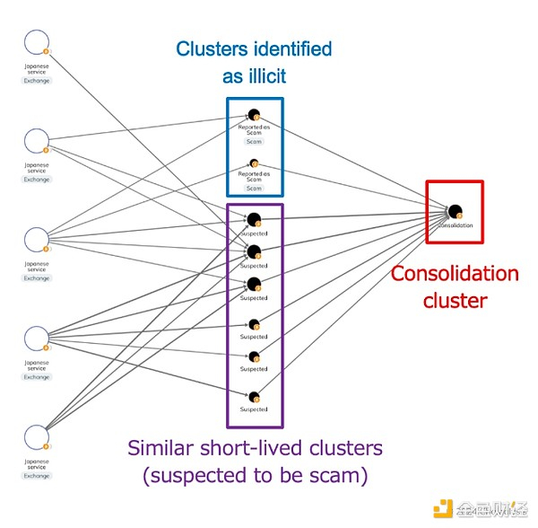 – 蓝色:资金从日本交易所流向可疑诈骗地址