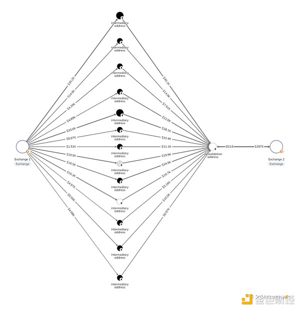 交易所还可能受益于监控与其服务交互的合并钱包。当洗钱者通过许多中间钱包将资金分层时,交易流程通常并不简单和线性。相反,洗钱者可能会将资金分成许多不同的钱包,然后在多次交易后重新整合资金。