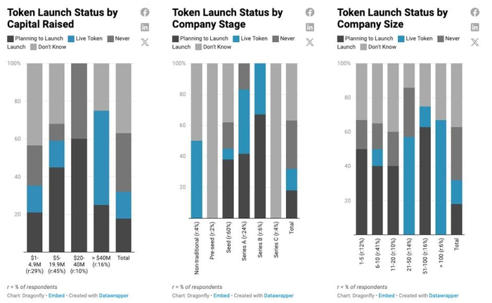 Dragonfly Capital 曾在 2023 年对 49 家加密企业进行调查,其中多数强烈考虑采用代币,只有 14% 的公司明确表示他们永远不会推出代币,随着融资额、阶段和规模的增加,公司更有可能计划和推出代币。