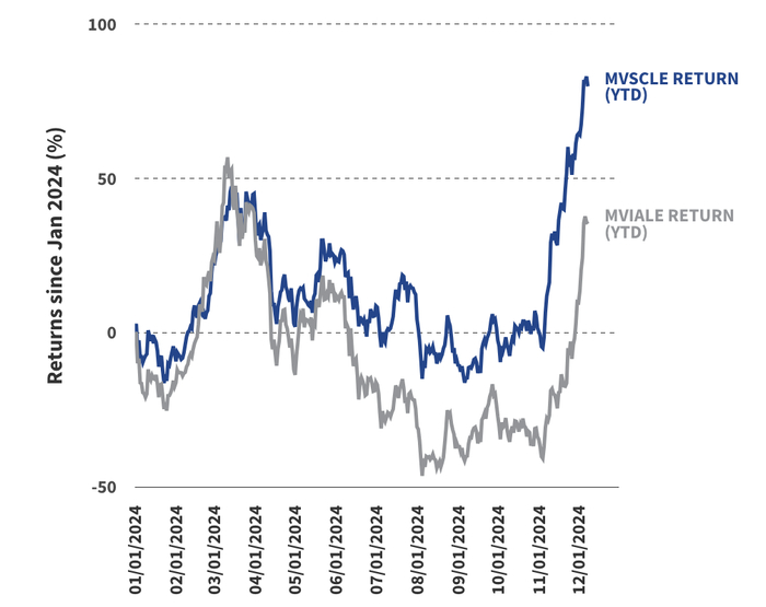 2024 年牛市的一个显著主题是 Layer 1(L1)区块链代币显著优于去中心化应用(DApp)代币。例如,追踪智能合约平台的 MVSCLE 指数年初至今上涨 80%,而应用代币的 MVIALE 指数同期仅上涨 35%。