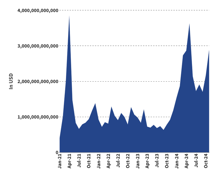 月度稳定币转账(美元)同比增长 180%(2024 年)