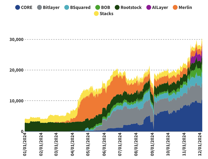 Bitcoin L2 锁仓量在 2024 年达到 30,000 BTC,年初至今增长 600%