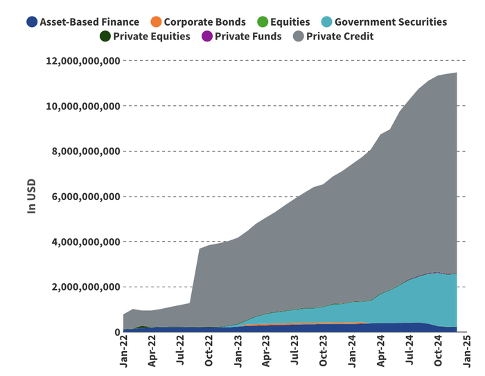 加密网络通过提升效率、实现去中心化和提高透明度,承诺带来更优的金融系统。我们相信 2025 年将成为证券代币化起飞的一年。目前,区块链上的证券代币化总价值已达到约 120 亿美元,其中大部分(95 亿美元)是 Figure 平台的半许可链 Provenance 上的私募债券证券。
