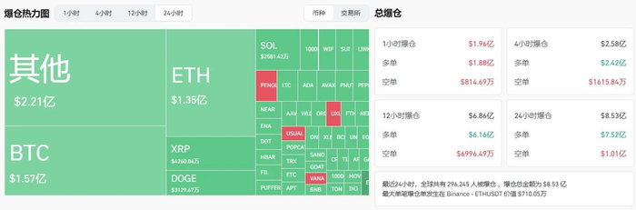 衍生品交易方面,Coinglass 数据显示,过去 24 小时全网爆仓 8.53 亿美元,其中多单爆仓 7.52 亿美元,空单爆仓 1.01 亿美元。从币种来看,其中 BTC 爆仓 1.57 亿美元,ETH 爆仓 1.35 亿美元。