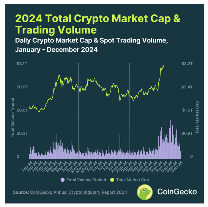 2024年,加密货币市场总市值几乎翻倍,增长了97.7%。其市值在12月中旬达到了3.91万亿美元的历史最高点,之后回落至3.40万亿美元。同时,2024年第四季度的平均交易量为2007亿美元,比第三季度的880亿美元增长了128.2%。