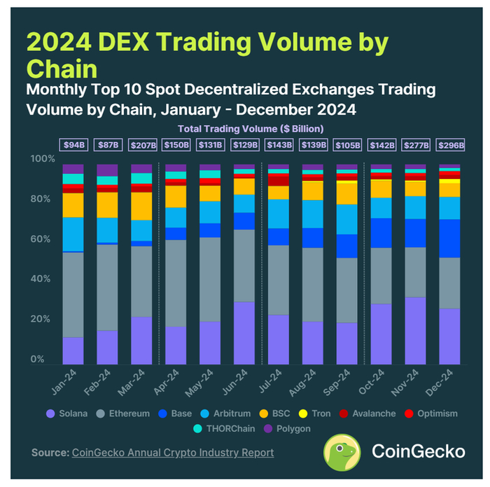 7、Solana超越以太坊,成为2024年第四季度去中心化交易平台(DEX)交易的主导链,占所有交易的30%以上