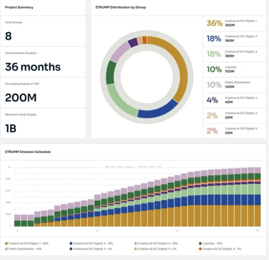 而从代币分发来看,TRUMP总供应量为10亿枚,但最初流通仅为2亿枚,剩下8亿预计将在3年内线性解锁。看似平平无奇,但从分配比例而言,真正获益者就昭然若揭。利特朗普集团的两家附属公司占据绝对份额,特朗普旗下企业CIC Digital LLC及Fight Fight Fight LLC将坐拥80%的TRUMP代币,锁定期为3-12个月,未来24个月内解锁。