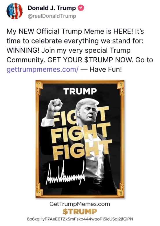 当地时间1月18日上午10:00,特朗普在其创办的社交媒体Truth Social 上发文宣布,即将推出个人 Meme 币 TRUMP,用户可访问域名为“GetTrumpMemes.com”的网站以购买该代币,配图是其标志性的握拳高举图片。