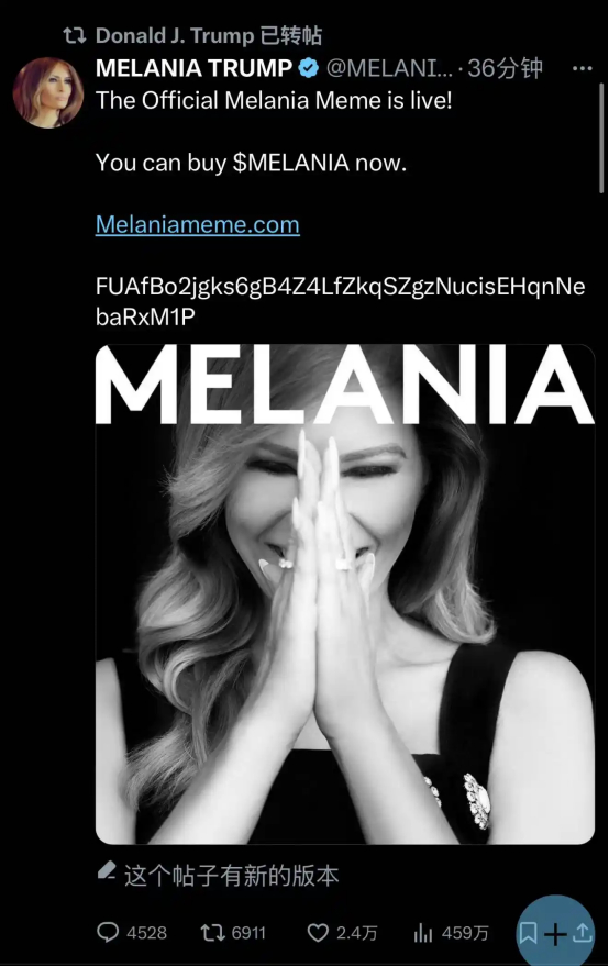 无独有偶,今早,特朗普夫人梅拉尼娅也再度推出了同名MEME代币。地产世家变加密世家?总统的敛财目的似乎正昭然若揭。
