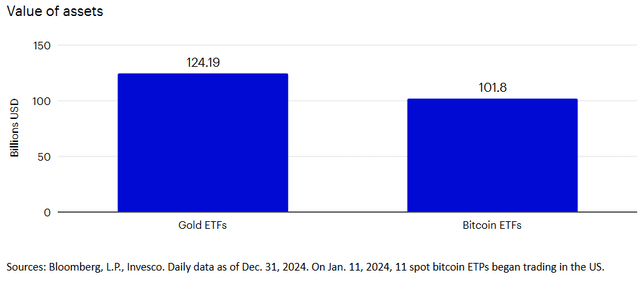 随着比特币市值的不断增长,投资者对这款龙头加密资产的态度也在不断转变。2024年1月,美国推出了广泛可接触的现货比特币交易产品(ETF),这标志着一个重要的里程碑,世界最大资本市场为投资者提供了一个便捷的途径,让他们能够轻松投资比特币(未来可能还包括以太坊)。例如,截至2024年1月11日,美国投资者已经向现货比特币ETF投资了406亿美元,到2024年底,这一产品的总资产达到了1018亿美元。相比之下,黄金ETF的管理资产为1242亿美元。