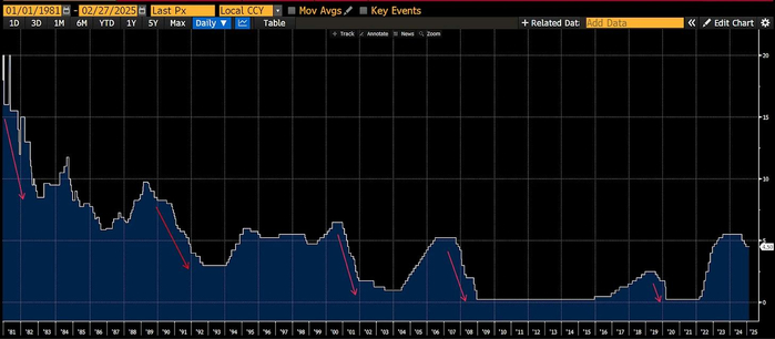这是美联储基金利率下限的图表。每个红色箭头代表一个降息周期的开始,这些周期与衰退同时发生。很明显,美联储至少会在衰退期间降息。