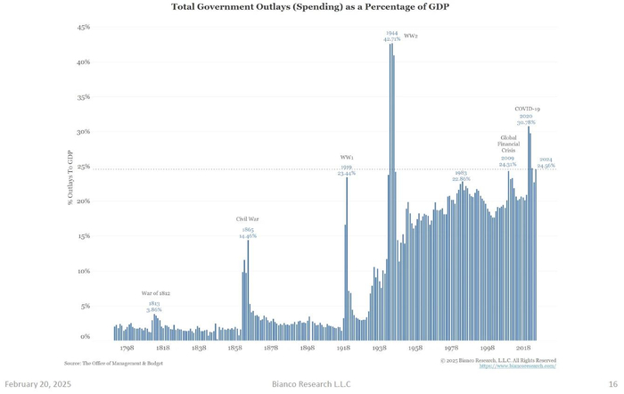 ● 官僚体系瘦身:预计 2025 年裁减 40 万联邦雇员,仅初期裁员已导致华盛顿特区房价暴跌 11% (Parcl Labs 数据)