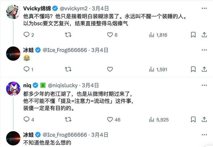 从去年 12 月为 Certik 背书称‘绝对可以信任’,到近期的 TST 以及自家宠物狗‘西蓝花’的闹剧以及将 HashKey Global 上 BNB误认成香港认可 BNB并自爆‘第一次使用 DEX’,CZ 近期的种种言行都在自损行业形象。而就转发 STAR10 一事,KOL @Sea_Bitcoin指出,CZ 只是向想要借助 Memecoin 为 BNB Chain 引流,只是自己‘看不懂、玩不会’,导致短期功利心太强,动作变形。@Ice_Frog666666则猜测,CZ 的认知可能更接近 Web2 500 强大企业高管的思路,习惯把事实陈述和价值判断完全切割开。CZ 不明白的是,在 Memecoin 市场中,‘散户的决策逻辑高度简化,他的任何言行都会被提炼出利空/利好的二元属性,其言论本身的客观性会在这种二元属性的传播语境下被彻底消解。’然而,许多 KOL 也提出了不同的观点。@niqislucky认为 CZ‘不可能不懂“提及=注意力=流动性”这件事,装傻一定是有目的的。’@vvickym2也表示,CZ‘只是揣着明白装糊涂罢了。永远叫不醒一个装睡的人。’
