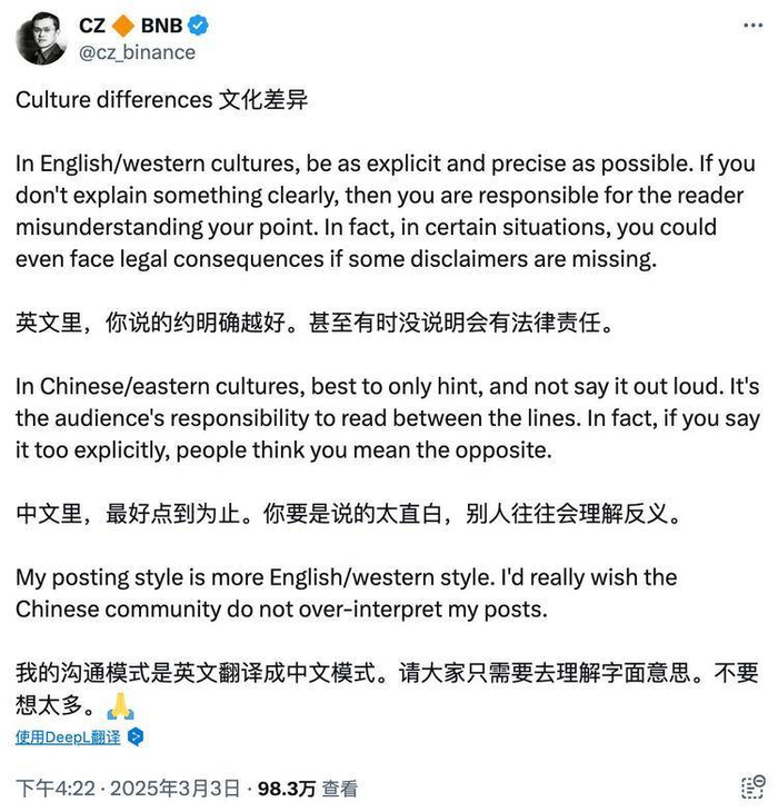 眼看着舆论不断发酵,CZ 也试图挽回形象,先是转发了 GoPlus Security 的推文,并提醒用户注意风险,随后又将争议归结于‘文化差异’,称‘英文里,你说的越明确越好。甚至有时没说明会有法律责任。中文里,最好点到为止。你要是说的太直白,别人往往会理解反义。’CZ 表示,自己的沟通模式是英文翻译成中文,并请大家只理解字面意思,不要想太多。