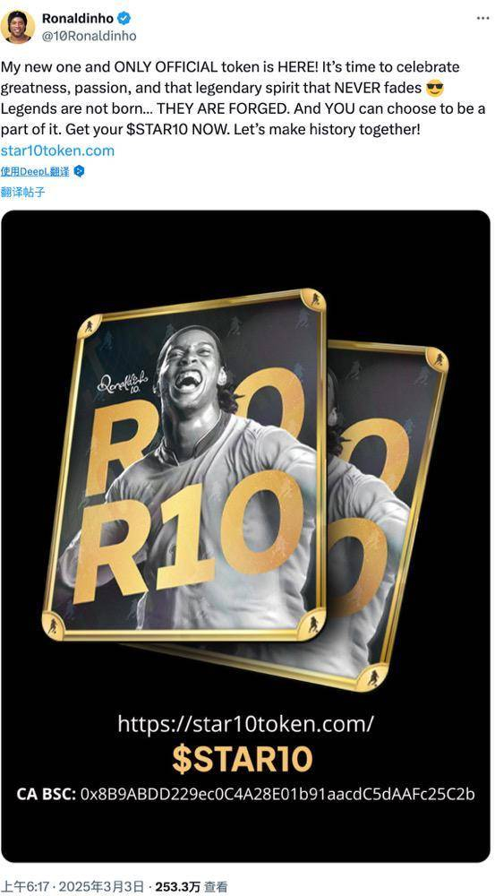 继阿根廷总统发布 Libra 并引发市场关于‘名人币’镰刀骗局的担忧后,昔日的巴西足球巨星罗纳尔迪尼奥(小罗)于周一清晨时分宣布在 BNB Chain 上推出代币 STAR10 并公布 CA 地址。然而,考虑到小罗近些年败坏的名声以及前几轮‘名人币’的惨痛教训,Memecoin 爱好者们并没有像往常那般,借着大洋对岸仍在过周末的契机大肆交易。Dex Screener数据显示,该代币市值虽在小罗发推后涨至 2 亿美元左右,但随后或因多条关于部分内部地址抢跑交易获利的爆料,开始回落,行情不温不火。