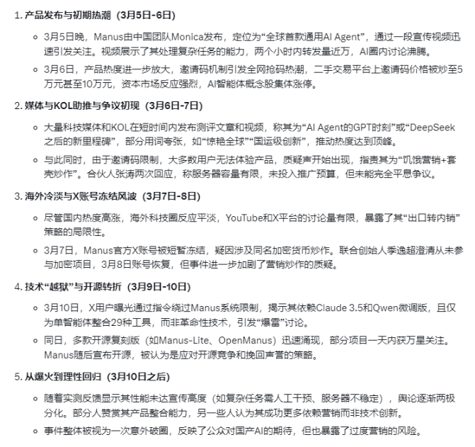 首先,我让 Grok 总结了 manus 这段时间的营销大事件: