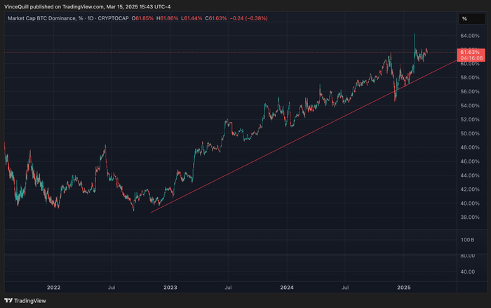 目前比特币的市场主导率约为61.6%,低于2月3日创下的64.3%的局部峰值。