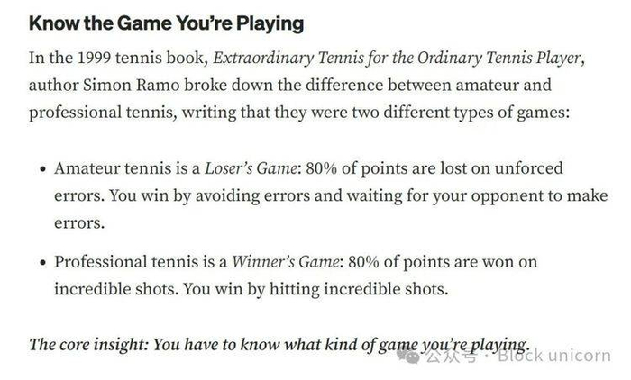 在第一种情况下,网球选手必须尽力减少失误,因为只要做到这一点,他们就能击败大多数犯错较多的对手。这是一个输家游戏,因为比大多数人输得少就能让你成为赢家。